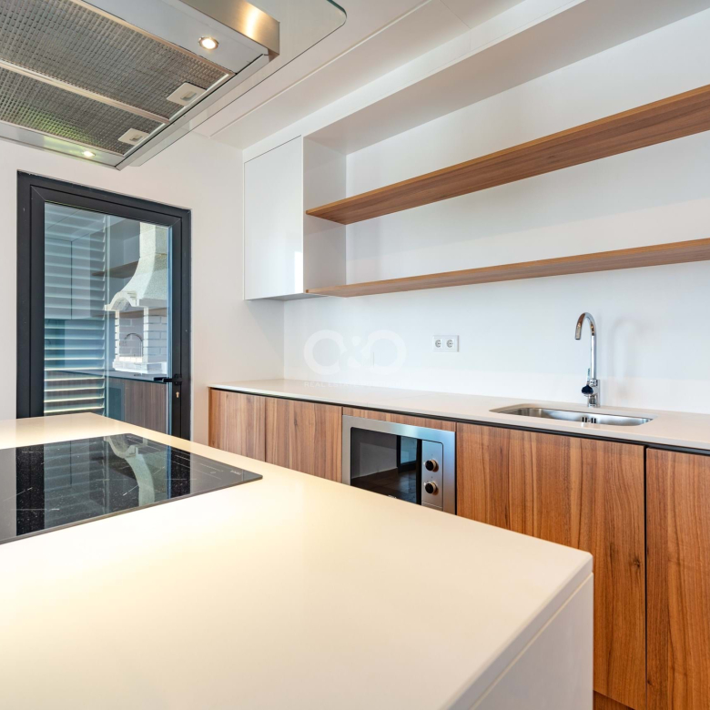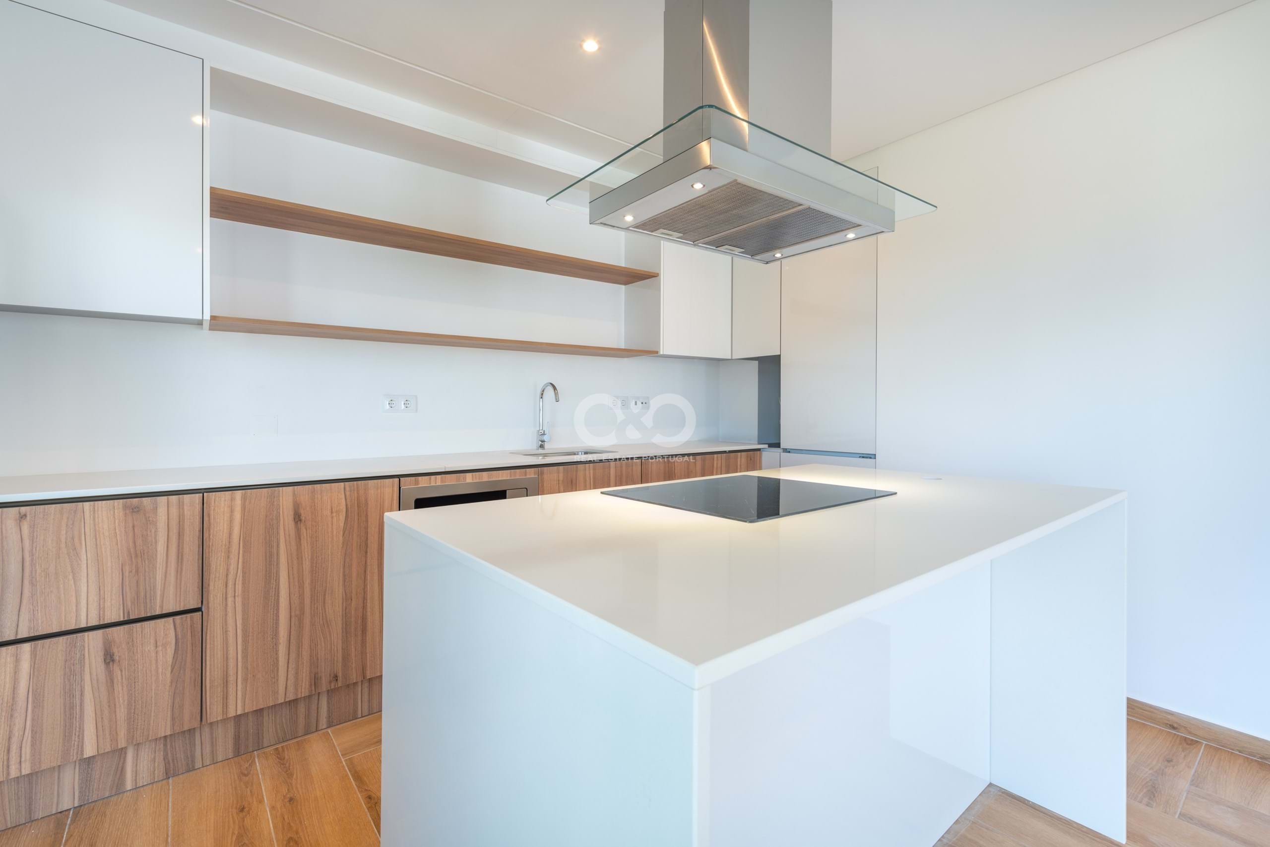 Les sols en carrelage et en bois contrastent avec les murs blancs et les menuiseries, apportant un sentiment d’harmonie, complété par des faux plafonds avec éclairage LED intégré.